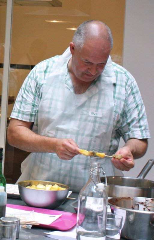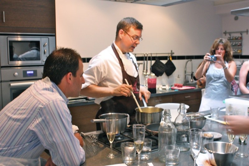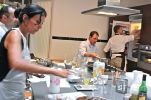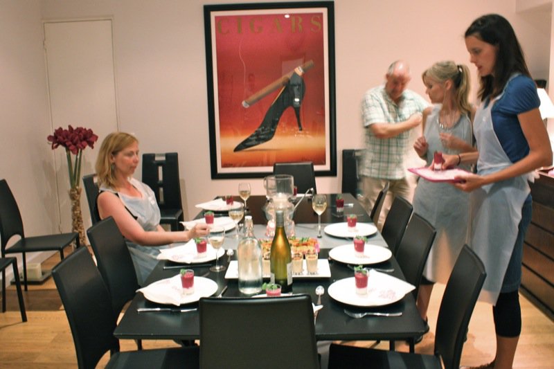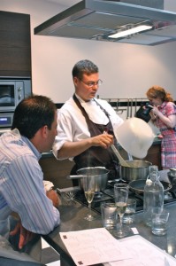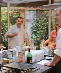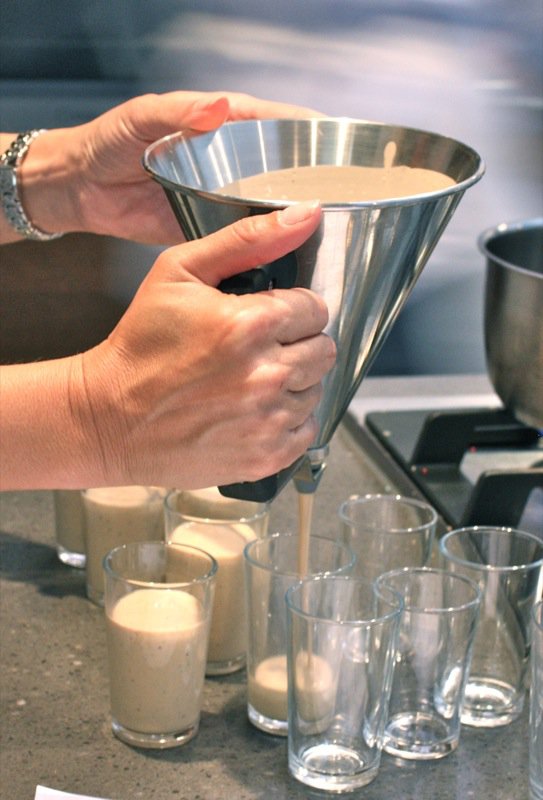 Across the table, Jo and her husband (from England) are preparing the shrimp. The foie gras is already to be poured into the glasses and placed in a bain-marie for baking in the oven! See the photo below, right? This is the first time I have ever seen such a kitchen tool of such incredible accuracy. “What is it, Chef?” Why? “I want one!” Oh, you do not want that! It is far too expensive. (Do not say that in front of my husband, Chef!) “What is it?” Eventually, I learned it is called a “piston”, and to not buy one with any plastic bits. (And, I did not when I went on my Kitchen Shopping Supplies “spree” the following morning; more on that in an upcoming post!)