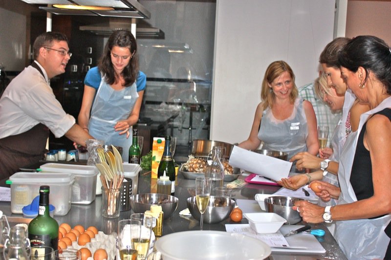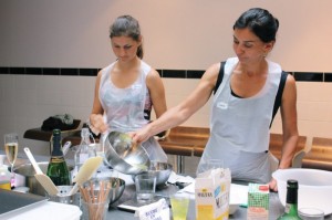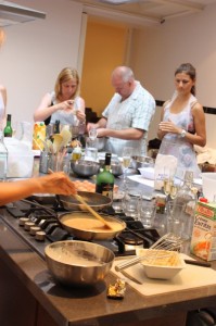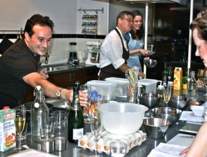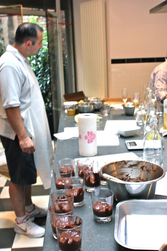 Of course, he really didn’t care, and was a great problem solver. However, all were completely avoidable and unnecessary. In this case, nowhere in the recipe do the instructions say when to add the sugar, so the gals didn’t. They had it left over, and the mousse was a little bitter, they thought. Somehow, the problem was solved. Our recipe had errors everywhere. (All are corrected, below.) So, though it was a really fun class, this was a major oversight that caused a considerable amount of unnecessary chaos.