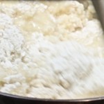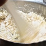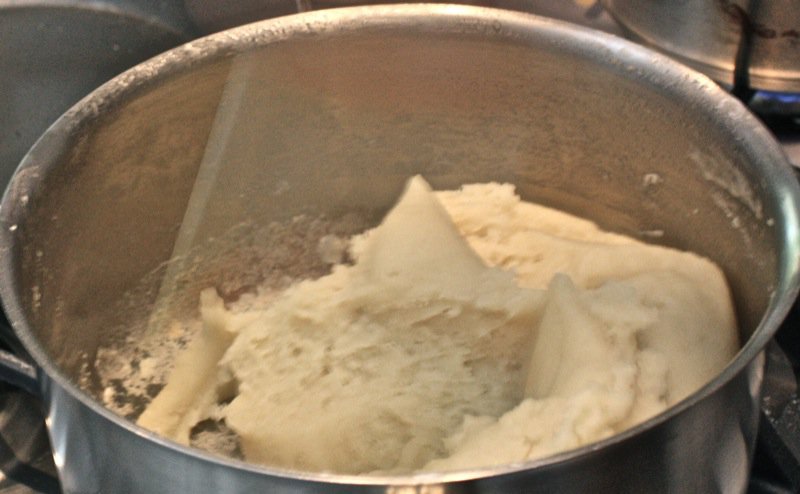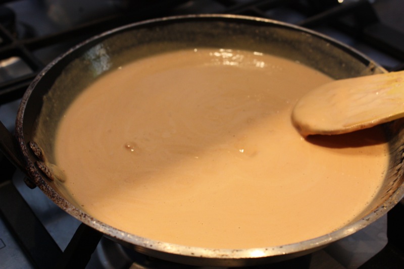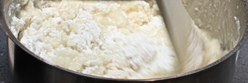 - Bring back onto medium heat and continue to stir rigorously until the mixture forms a dry ball that comes away from the pan; continue to cook this ball until you can see a brown film or thin crust forming on the bottom of the pan