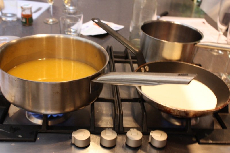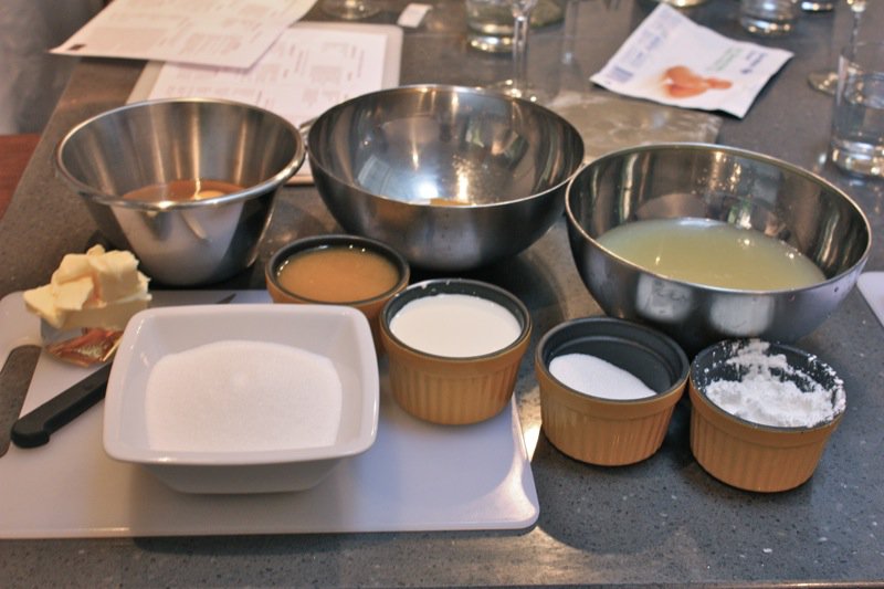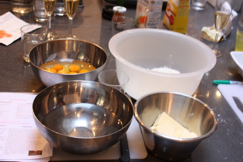 What was I doing all of this time? (Not taking photos, as it may appear. It was really hard to try to keep up, that is why they are so blurry!) Chef Sous and I were getting our mis en place and as you can see by the following two photos that it was no easy chore! The one directly below is for the citron mousse and the one following is for the choux pastry. I feel inclined to add that the exact verrines above were at one of the shops I was at the following day for about 2 Canadian dollars each and I did not buy any. (Did I want to? Yes! Did I already buy a lot? Too much!)