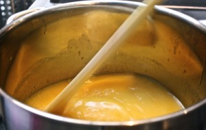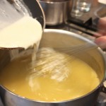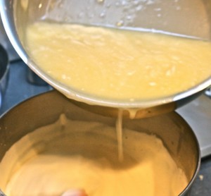 - Temper the egg mixture with the hot lemon juice, mix well, and pour the tempered egg mixture back into the sauce pan with the hot lemon juice