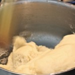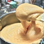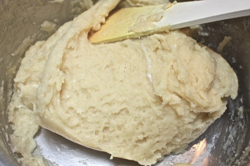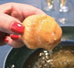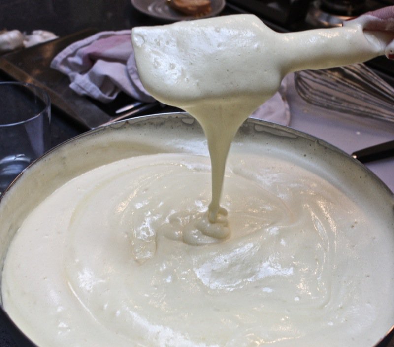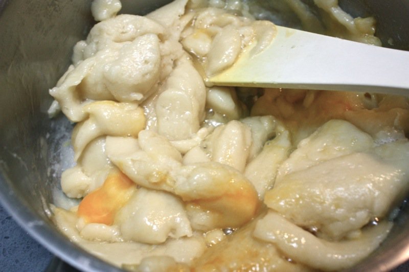 OK. The last eggs are almost worked through. You can see the final product on my finger, and in the tiny little very blurry photo below Vanja. The important thing to note is that the dough must form a “claw”, or stand on its own in a tip as you dip your finger into it. If it falls a little (claw like) that is fine, but it must be stiff enough to hold that shape. To the right of my finger is a claw like piece. I believe you can see the batter is stiff.