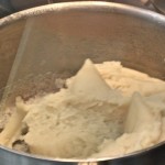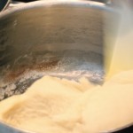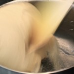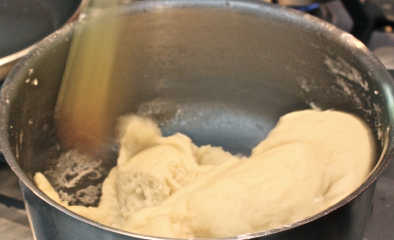 So, the water has just boiled. The butter is melted, and Chef Justin has called around the crowd. The first thing he did, above, right, was to dump all of the flour into the hot butter water at once. Then, he stirred and stirred, rigorously, over medium high heat to incorporate the dry ingredients with the wet ingredients until they came away from the side of the pan in a ball.