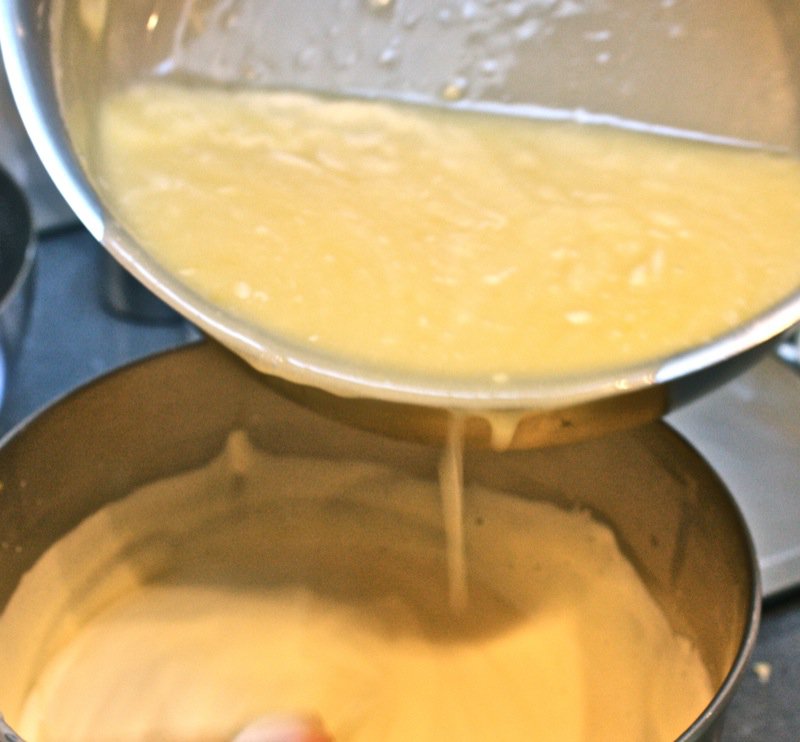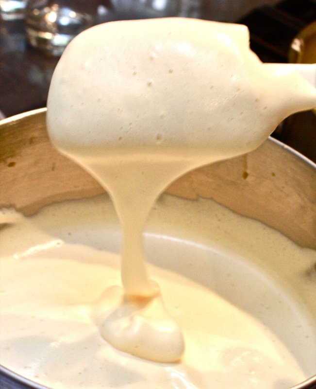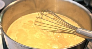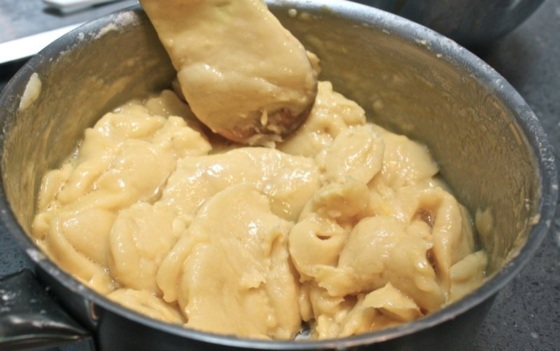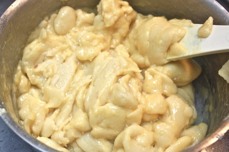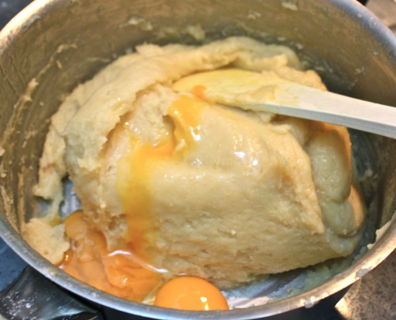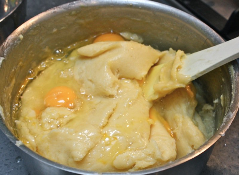 - Remove from the heat and beat in the eggs a little at a time, until the mixture is smooth and glossy