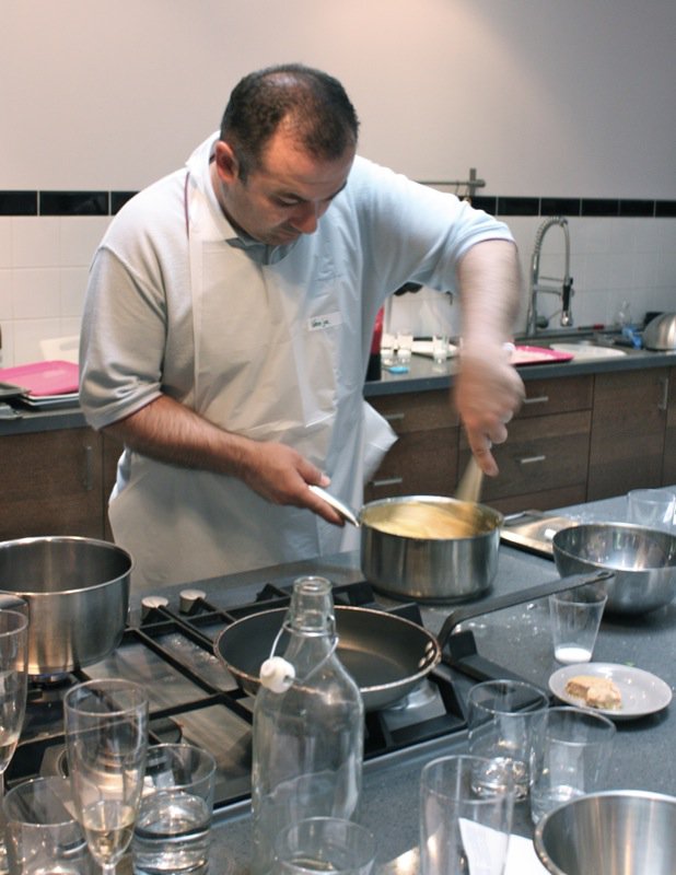 After our ingredients were prepared, we were to melt the butter in the water and just bring it to a boil and then call Chef to demonstrate making choux to the group. So, while that was heating, I caught up a bit more. The two gals to the left below made the mousse. The gals at the opening photo made the beet soup, below, right. Both were really delicious. I did find and buy the vinegar in the beet soup recipe. It made a huge addition to the flavour and I haven’t heard of it, so doubt I will find it easily at home. Sherry vinegar may work in place as it is a sherry vinegar.