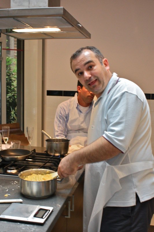 Actually, I did this. I had watched him do the stirring to the right point part which I really needed to learn. Now, incorporating the eggs is another important step, as the eggs are the reason the choux puffs up, so I had him watch and Vanja definitely helped. Ok, he did more that me. This was a double batch and it is hard enough to beat rigorously with one batch. Recipes I have used in the past have said to incorporate one egg at a time. Chef Justin said that was definitely not necessary, but that a few at a time worked well. We incorporated ours in 3 batches, I believe. Maybe four.