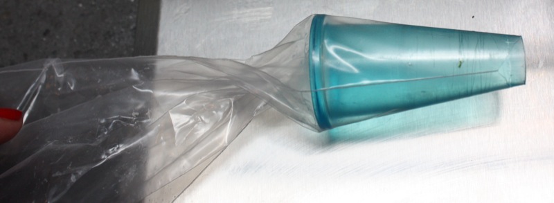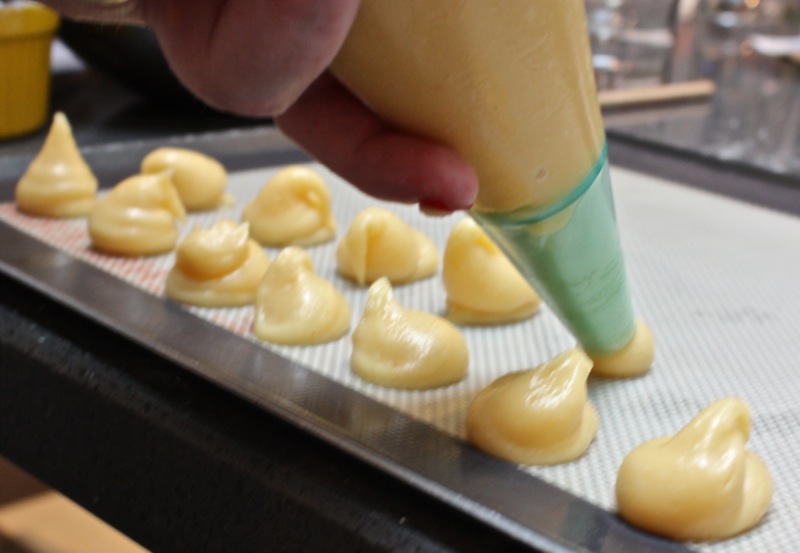 Into the piping bag. Remember the tip that Chef Antony taught us at Lenôtre? Push a little of the lower bit of the plastic pastry bag down in the tip to avoid any batter coming out while you fill it. Chef Justin did a couple, then I did the rest. There were 4 full cookie sheets in one batch. We made two. He told us just to through the rest of the batter out. I could not believe that. Nor, would I do it. I made them all and suggested he or the one cleaning person take them home, or that he leave them for the owners of the cooking school. I am sure they went into the garbage.