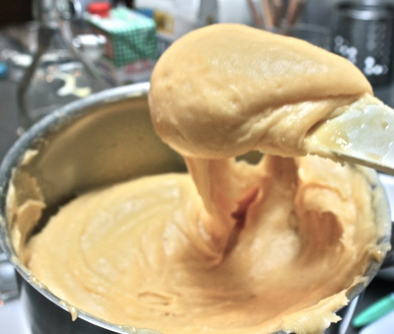 Once that was done, he continued, over the same heat, to stir the dough ball as rigorously to cook the flour a bit before incorporating the eggs. Look below at the side of the pan in the first frame, and you will see that this has started to happen. He then continued to stir rigorously for a minute to two more, at least, before taking the pan off of the heat to incorporate the eggs, a few at a time.