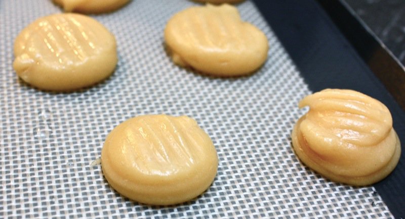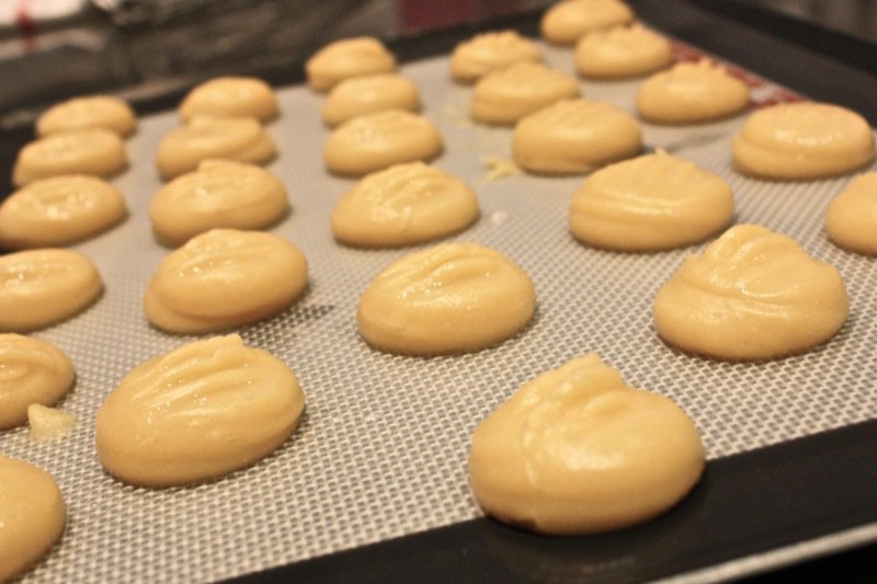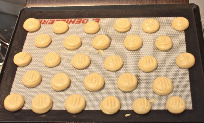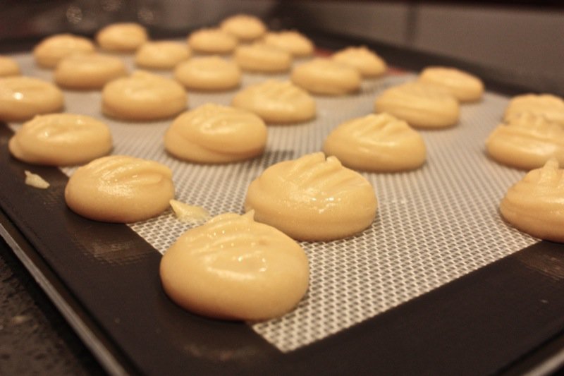 Chef Sous wet the end of a fork, and flattened all of the little works of art perfectly. If we were not going to caramelize them, we would have brushed egg over them for a shiny finish.