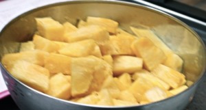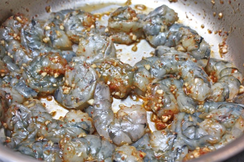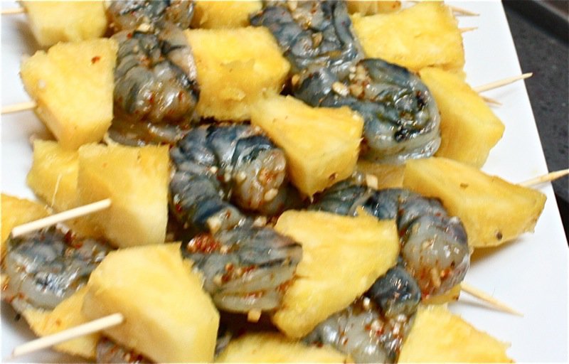 - Place marinated shrimp and pineapple cubes on skewers, three shrimp on each