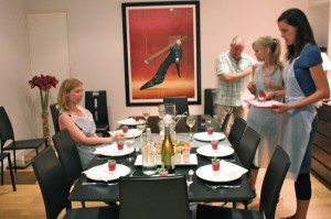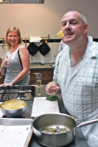 The ovens in the adjacent kitchen had been preheated for these and in they went for 25 minutes: no peeking! That is important: no opening of the oven door for 25 minutes. Whew. Still more to pipe, but that was a lot of work: a great learning experience and fun, too! What is everyone else doing? Mainly visiting and enjoying the Champagne as they finish the final touches on their dishes.