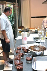 Ah! There is the photo of the chocolate mousse. The only one, too: below, left. They ran out of verrines and the gals had a heck of a time getting the mousse into the glasses. Quite a messy job: thank goodness for whipped cream! I guess no one told them about the piston!