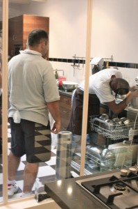 ….there were massive glass doors opening into a beautiful modern stainless kitchen where a pull down metal door had hidden it all the night prior!