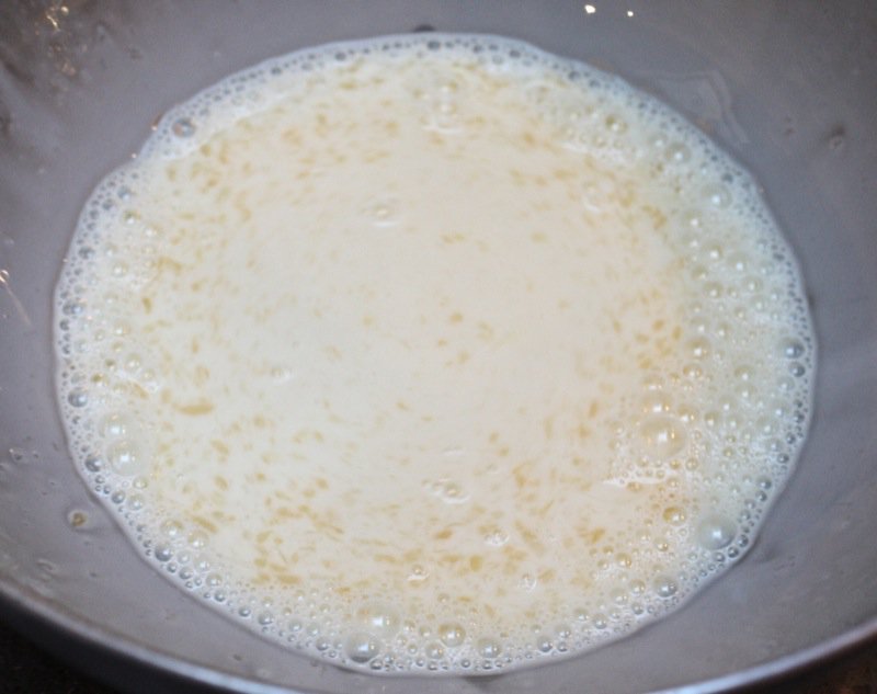 Now the egg mixture is tempered and then added to the pan with the hot juices.