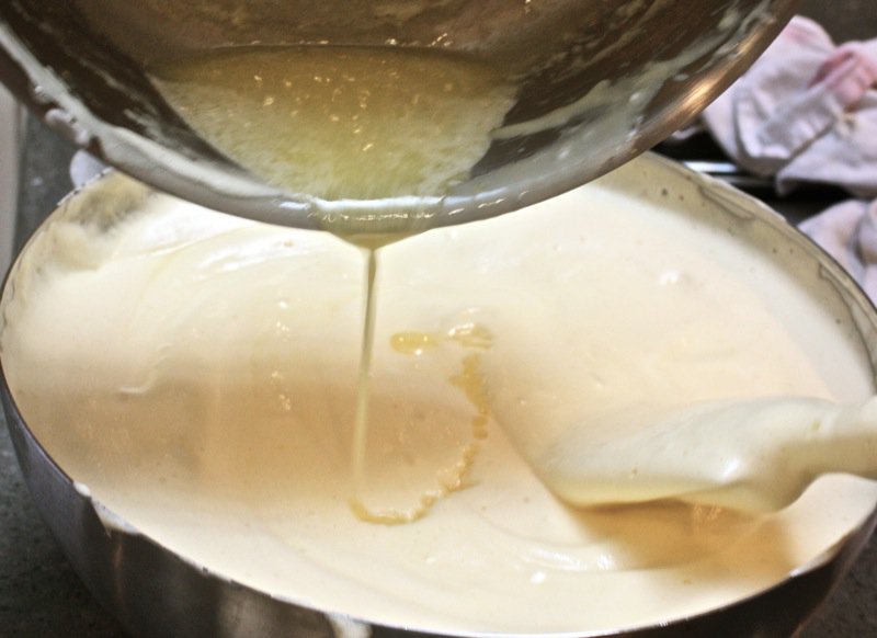The butter needs to be added (it was not written where or how in the recipe) and the mousse is transferred to a large bowl for refrigeration.