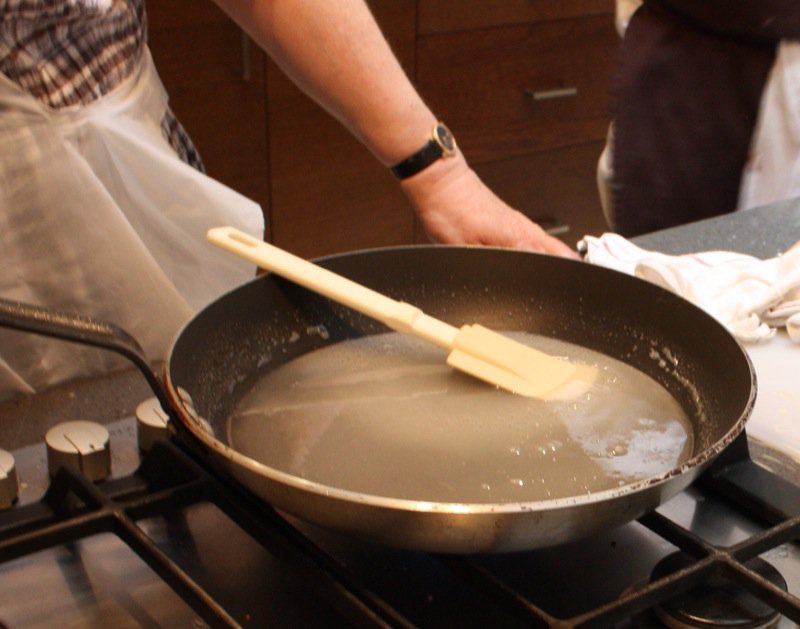 The caramel instructions were make a caramel and dip the choux in it. There was no tip to use to fill the choux with the mousse. Hmmm. I had made caramel, but not the dry hard kind like this. I avoided that as I really didn’t know how. Fortunately, I had just had a lesson from Chef Antony at Lenôtre the day before, or I would really be out of luck. Chef Justin was busy visiting with a couple and I could not get his attention for love or money to assist with the caramel. Meanwhile, the port is still reducing. Somehow, I do not think that will be enough for 11 of us… but it will be really, really good!