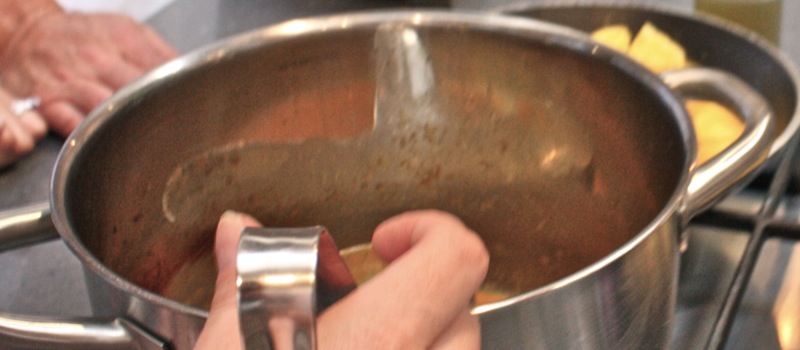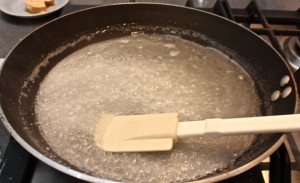 - Watch for signs of the beginning of caramelization and swirl the pan to keep the sugar moving around the hot spots; replacing on the heat as much as possible, until caramelization is achieved, or almost achieve as it will continue to cook in the pan