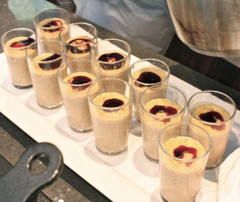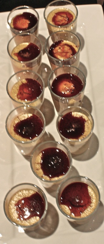 Verrines: Foie Gras, Chocolat Mousse, Cold Beet Soup; Petit Caramel Citron Choux and Shrimp and Pinapple Skewers