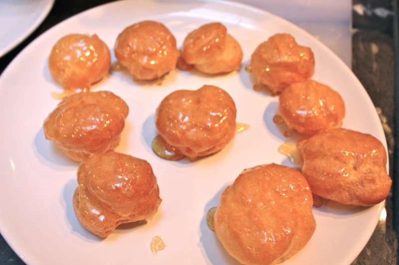 It still tasted incredible and was voluminous and gorgeous. However, one more comment on the negative side (and those that read here often will know I am not a negative person), the mousse should have definitely been made first. What was I thinking, let alone Chef Justin? For me, I guess I was just doing what I was told. There was not really time to read over the entire recipe and I trusted that the Chef was making thoughtful decisions about what order what should be made in. Also, I did not expect the mousse to be as time consuming, or such a huge a batch. Originally, we were told to do it three times. But when I told him how much lemon juice that required, as we were getting our mise en place, he then read the recipe and said that a double batch would be plenty. Plenty? Yes, if you are feeding 50 people. I am not kidding. I am sure this was enough mousse to easily fill 350 choux. We filled 30 and didn’t even put a dent in it. I would have filled many more, but had no more caramelized choux left, and people were getting ready to eat.