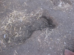 Above, left, is a dirt bath that the chickens have dug to keep themselves cool in during the hot summer days. Above, right, is the inside of the coop with the feeder just at beak level!