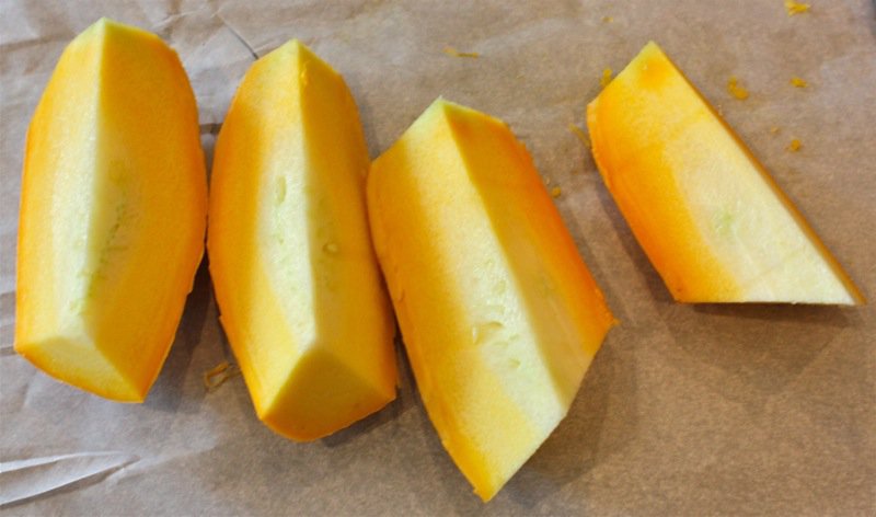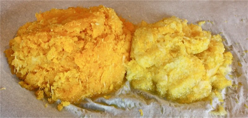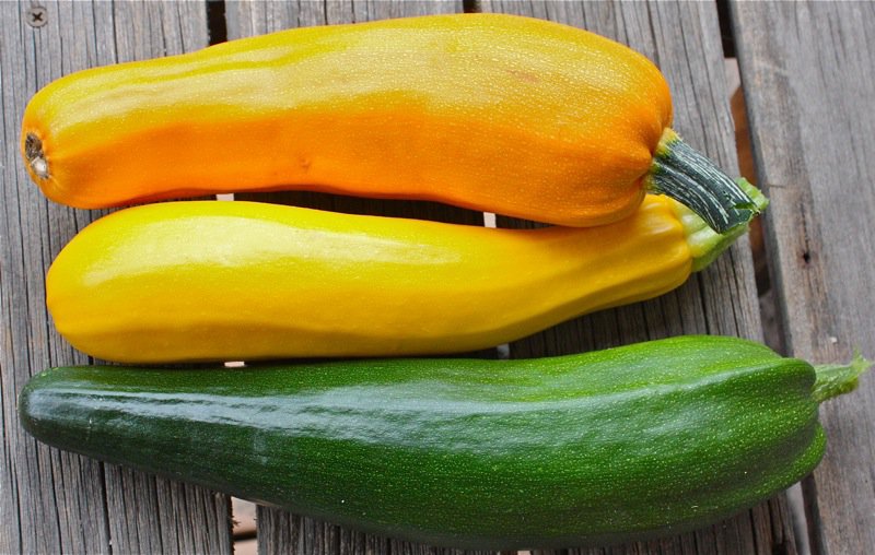 My three zucchini were very different inside. The orange one was dense and dry. The green one was dense and not quite so dry. The yellow one had seeds and appeared very moist. Yes, this all changed when I grated them.