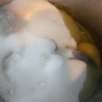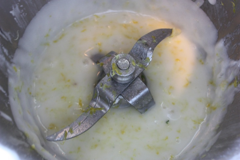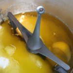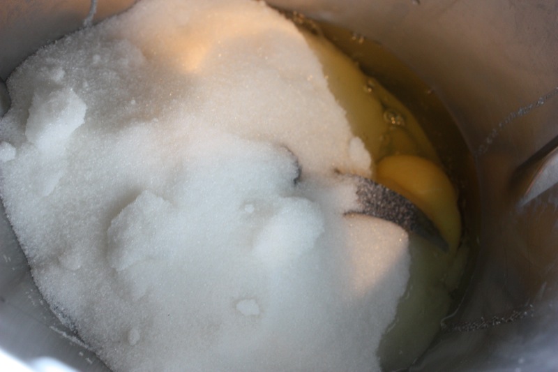 The eggs, sugar, vanilla and olive oil went into the TM bowl together to be whisked into frothy goodness.