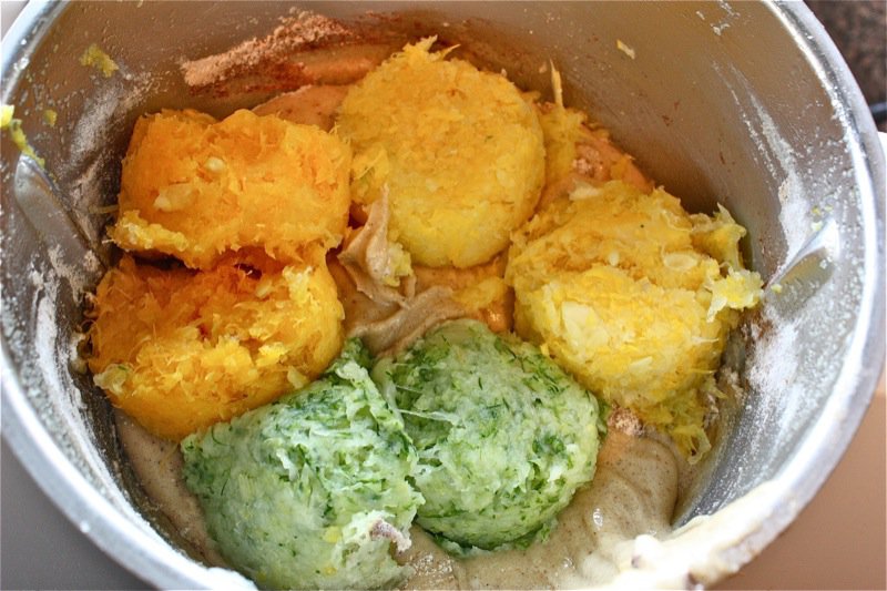 I chose to use some of each kind of zucchini. HH’s is actually prettier as the green peel gives the cake a beautiful green confetti appeal which is lost when using the lighter colours.
