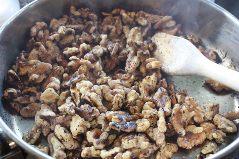 - Place the walnuts in a single layer in a frying pan and toast them until they are golden brown and aromatic: 12 to 14 minutes; stirring constantly; cool completely, and rub in tea towel to expel any loose burned skin