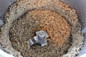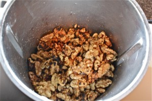 The recipe suggests that the nuts be toasted in the oven. I have lost way too many nuts that way, and even met some really cute firemen doing that. I choose to toast them on top of the stove in a frying pan where I am there tending to them as they take so little time. After toasting the nuts, I ground them in the Thermomix (good thing I have two TM bowls). This would be important to do first.