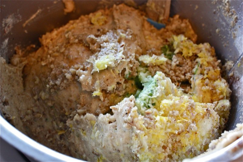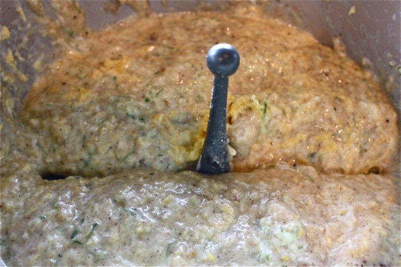 - Switch the mixer to medium speed and mix for 30 seconds; beat in the zucchini and the walnuts on low until completely incorporated, scraping down the sides of the bowl