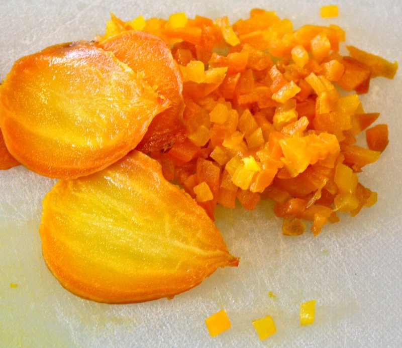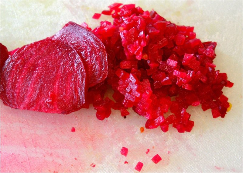 This time I was making a miniature tasting plate, so instead of dicing the beets, I tried to do a mirepoix as the mouthfeel with the mirepoix cut is extraordinary. Obviously, I need to practice. I was just not patient enough or accomplished enough to have each piece perfect which is the entire point. But, I did get a nice tiny dice which worked for my miniature mold.