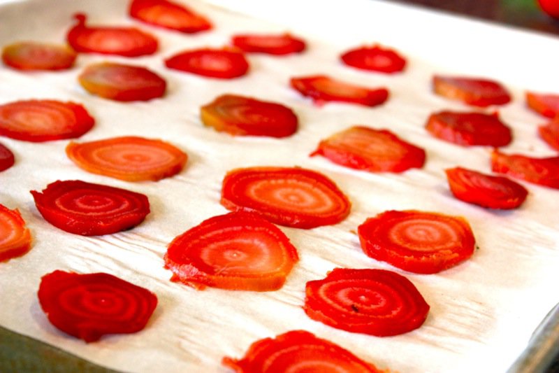 The beets were from Sundog Organic Farms at City Market downtown and I had expected the deep velvet burgandy flesh but got a translucent brighter ruby variety, instead. It was unexpectedly bright, and delicious. I decided to go “all out” on this tasting and do beets four ways. So, I made a little verrine of the Cold Beet Soup Vanja and I had at our Bastille Day Dinner cooking class in Paris. Then, I shaved the beet greens and sautéed them in garlic and planned to top that little spoonful with a beet ship. I “should have” used my mandoline, but didn’t want to take the time to get it out as I had so many other things on the go. I sliced the beets, placed them on parchment paper and placed another piece of the paper on top of them.