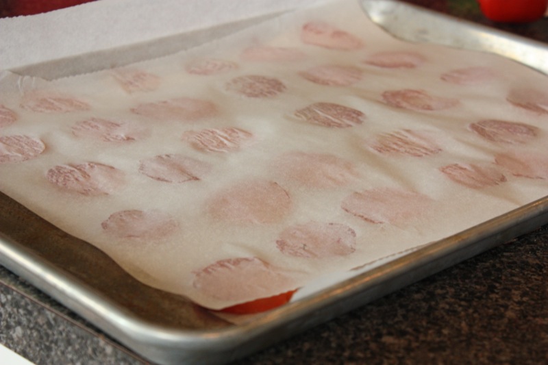 Then I sat a heavy cookie sheet on top (bottom, right) to bake them into a flat shape. I baked them almost like drying them: low and slow, and thought they turned out perfectly. They did need to be thinner, as they were a little chewy, instead of crispy.But, delicious, and even better with a little olive oil and sea salt.