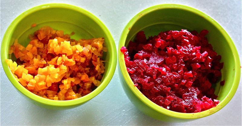 - When beets are cool enough to handle, slip off and discard skins; separately cut red and golden beets into 1/4-inch dice (for individual salads) and put in separate bowls