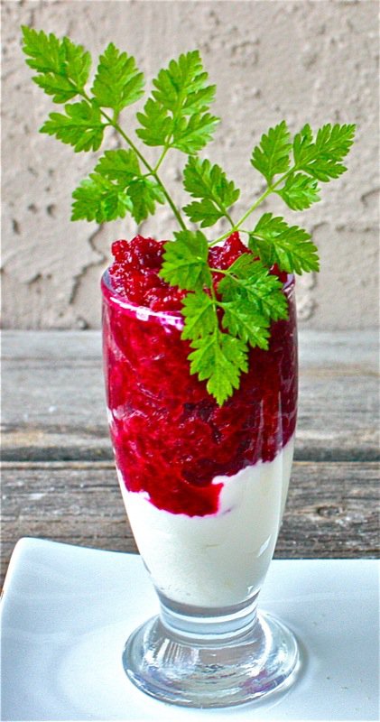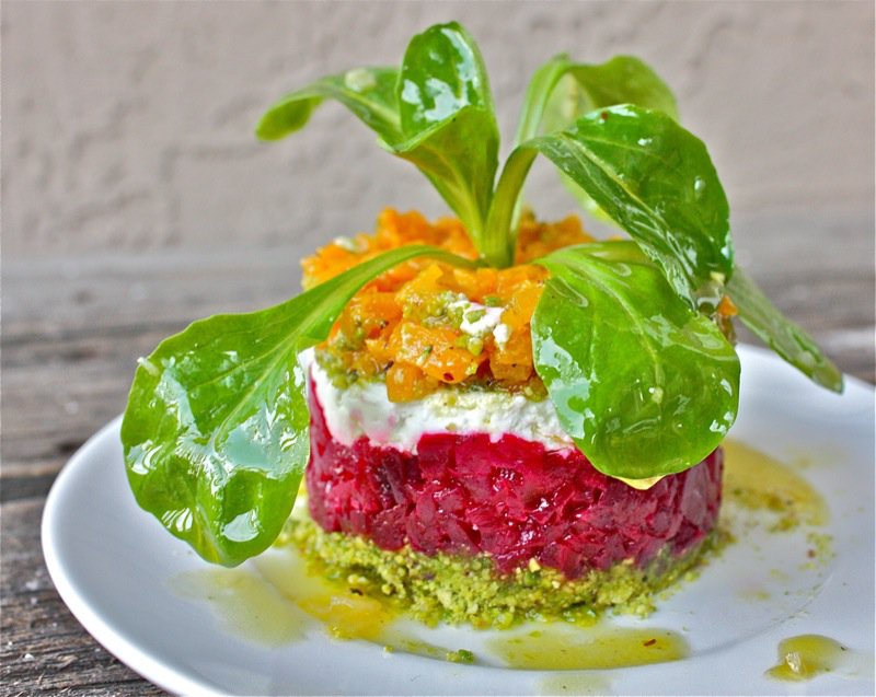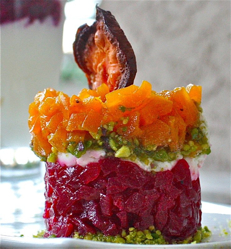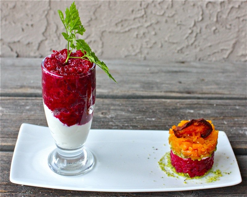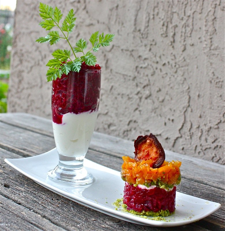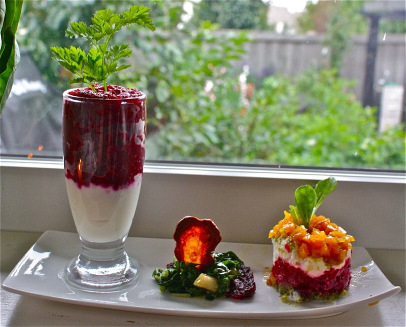 Beets for ways: Cold Beet Soup with Goat Yogurt, Beet Greens with Beet Chips, Pistachio Beet and Goat Cheese Salad