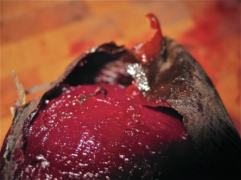 I am crazy about beets, and roasting them really brings out their earthy-mineral sweetness distilling the essence of the root vegetable as the process tends to dry out the root into a confit-like product which I adore. When they are cool enough to handle, they peel like a charm and your hands to do not get stained at all as they do when beets are boiled. The golden beets are so beautiful this time of year, as well.