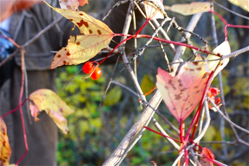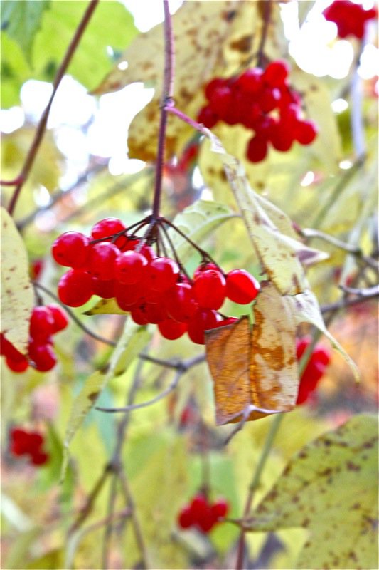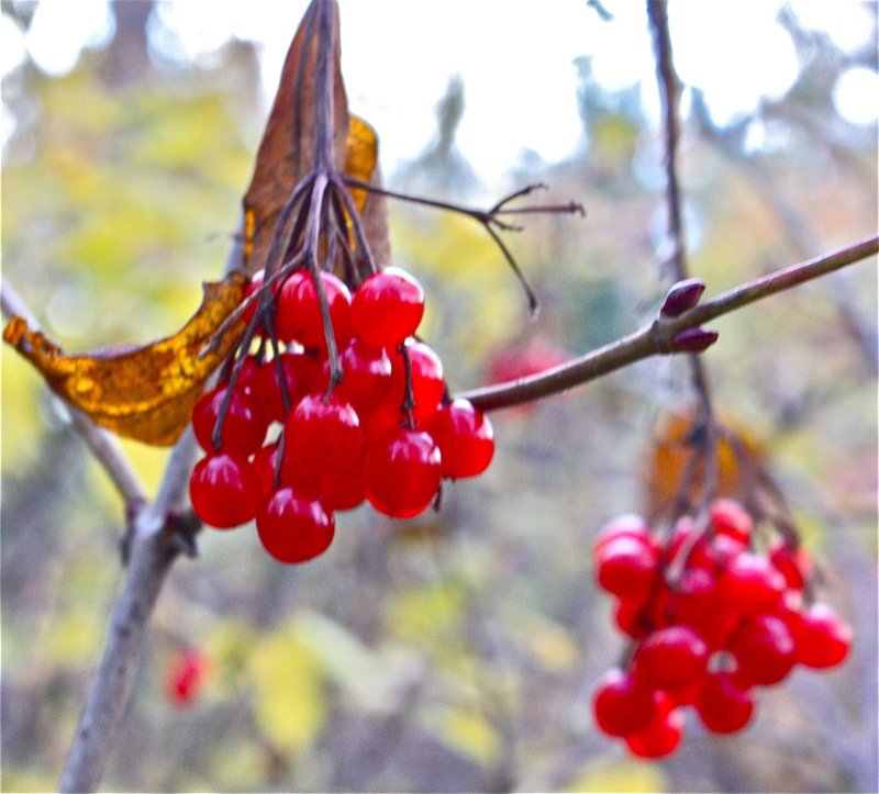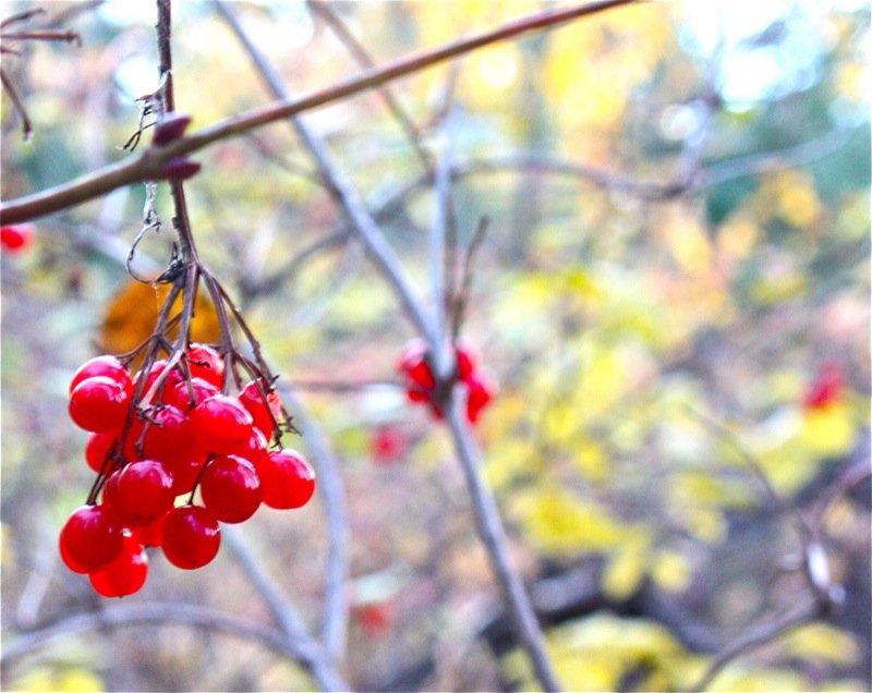A couple of days later, we were in the middle of our city on a very popular nature walk and the berries were abundant. And, I mean abundant! The warm sun and the blue sky were settling as we met at 6 pm near Snow Valley Ski Hill just off the Whitemud Freeway. Seconds later, we were breathing in the beauty this late autumn has painted for us. Crimson leaves. Golden leaves, Crunchy underfoot…. and high bush cranberries!