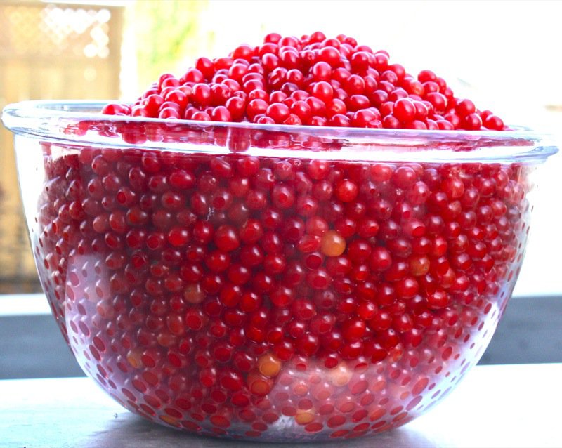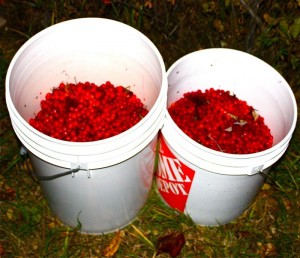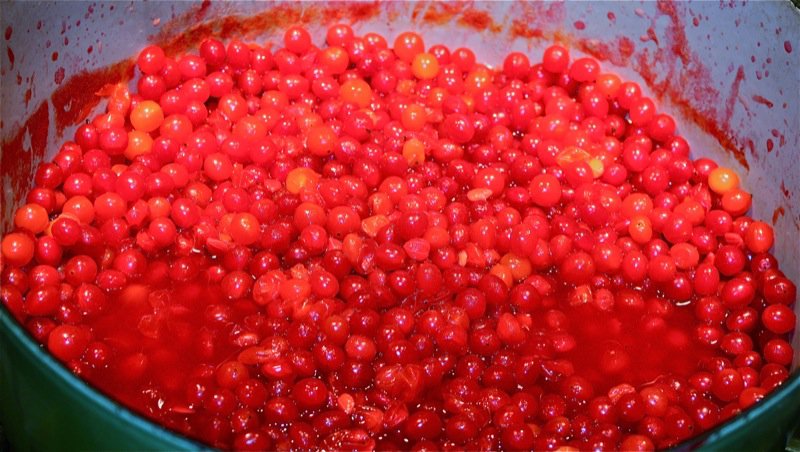 I added 2 pints of raspberries to the 5 pounds of cranberries I harvested. My gf has a family farm out by Devon, so we went there but you can also find them all over Hawrelak Park, (on the river side). I am in the process now of draining them, so I will get them canned tomorrow night! My gf’s mum says they are always better after the first freeze up. They get sweeter!