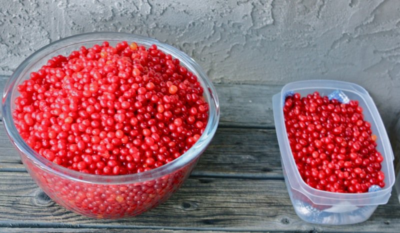 - 5 cups of high bush cranberry juice (about 4 pounds of cleaned berries and 4.5 pounds of uncleaned ones)