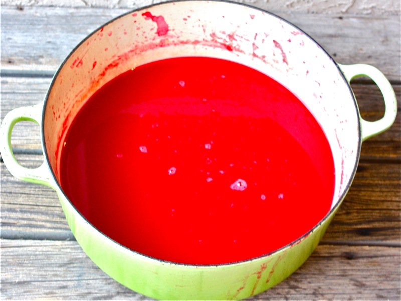 - Once all berries are squeezed, and no longer than 10 minutes on the heat at a low boil, strain the berries with cheese cloth and a sieve overnight; do not press on the berries, or the jelly will be cloudy and not have the lovely glistening transparent hue that is so sought after