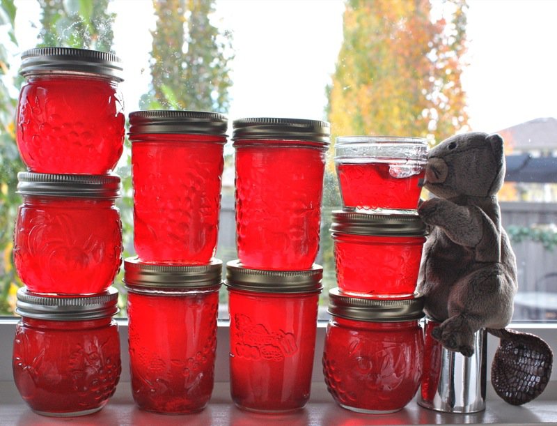 I grew up with high bush cranberries as a kid. We had a bunch of bushes in our yard at the lake. We made jelly and pyrahi (Russian tart) with them. When we were visiting our daughter in Edmonton, I went for a run along the whitemud ravine and noticed the high bush cranberries. We were back in Edmonton this last weekend and I picked a 4 liter pail and made jelly out of them. I used 4 cups of juice to 8 cups sugar and two packages of liquid pectin. The jelly was already setting while I was putting it in jars, so I could have probably cut back on the pectin. The smell of dirty gym socks while cooking the berries has always been a bit of a joke among our family.