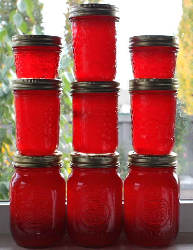 I used the 10 cups of juice and 5 cups of sugar with 2 packages of liquid pectin to make the syrup. I was hoping it would be thicker. It is a nice thickness, but I was hoping for a loose jelly. I should have known better with so little sugar. But, I was hoping that the pectin in the fruit and the added pectin would work some magic. No matter. It is incredible: much stronger and more tart than the jelly. I thought I might use it in a verrine dessert and add gelatin to it to make a lovely high bush jelly layer. That would be a deadly panna cotta. So many ideas have come to Vanja and I. He just wants to drink it with sparkling water. It would be lovely with Champagne, too!