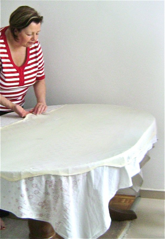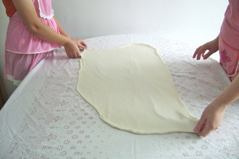 - Then, pull the dough out little by little around the table and around again until it covers the table and then pull it to just go over the edge of the table; use your fingers in a pinching motion very lightly
