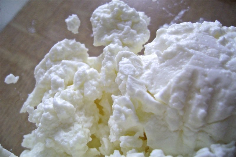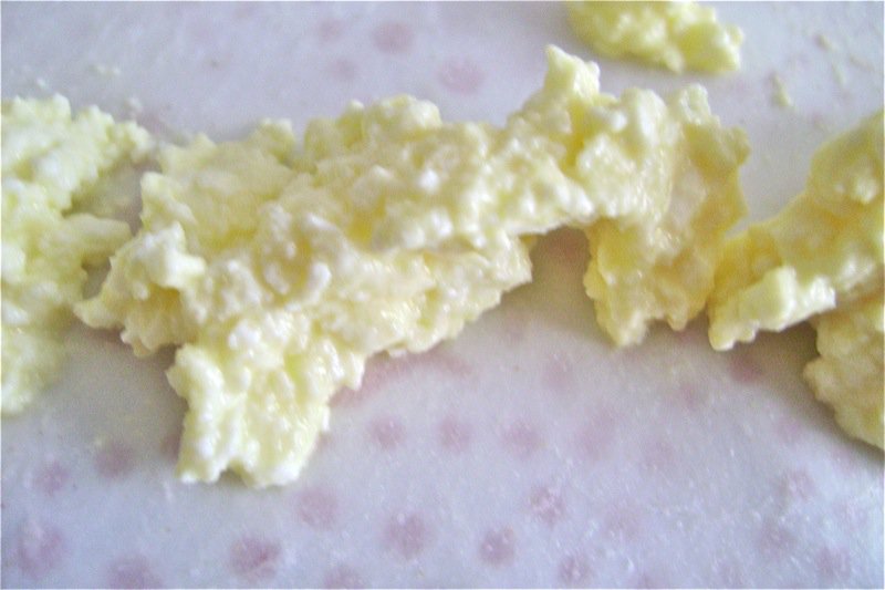 This looks like scrambled eggs, but it is young cheese with eggs and salt and pepper. The gorgeous yolks colour the cheese a really bright yellow to the egg yolk colour standard urban Canadians are used to.