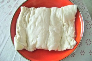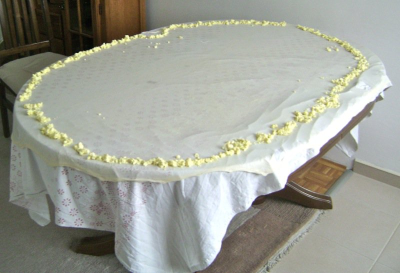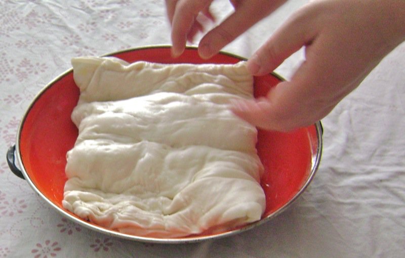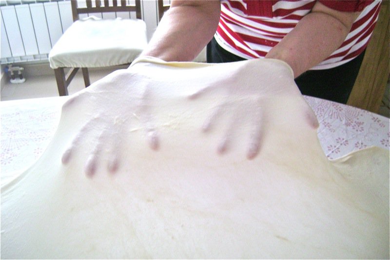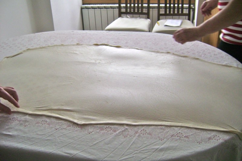 - Transfer one disc of pastry dough to the middle of the table covered with a boÅ¡ca (“œburek” cloth); using hands gently from the middle of the pastry to stretch it and lay it out