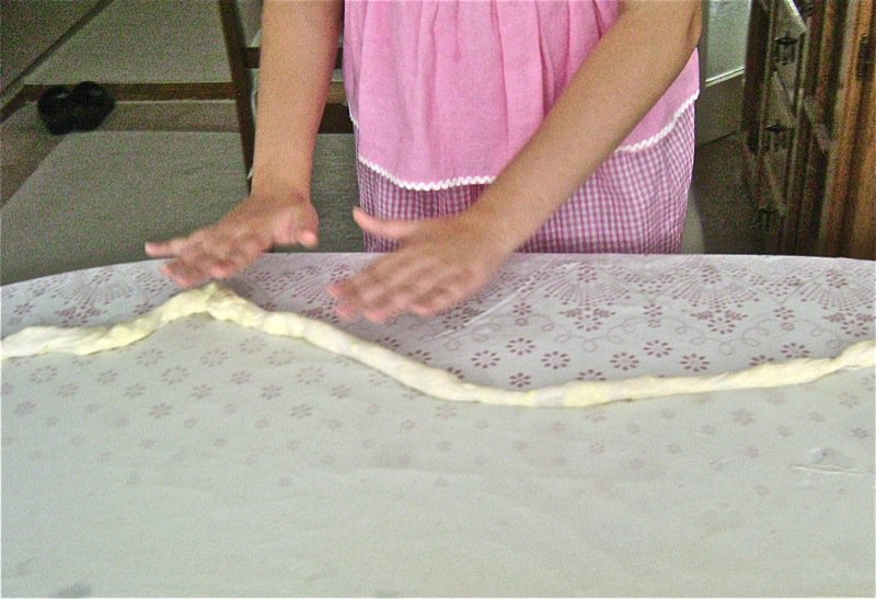 I could see I was going to be in the way. They really had it down pat. There were no words between them. They read one another’s mind and just moved from one section to the other pulling the dough out effortlessly, like magic. I was getting antsy. I needed a lot of practice. I remembered this feeling. I think I was in kindergarten when I last had it, waiting at the water fountain!