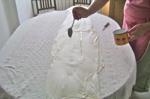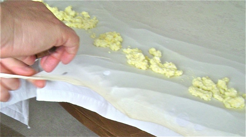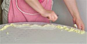 The dough is scored down the middle and the burek is rolled form each side into the centre to form two long rolls. But, first, Elsada drips a very careful amount of melted butter on the surface of the dough.
