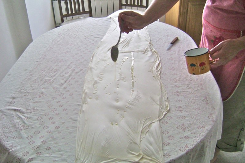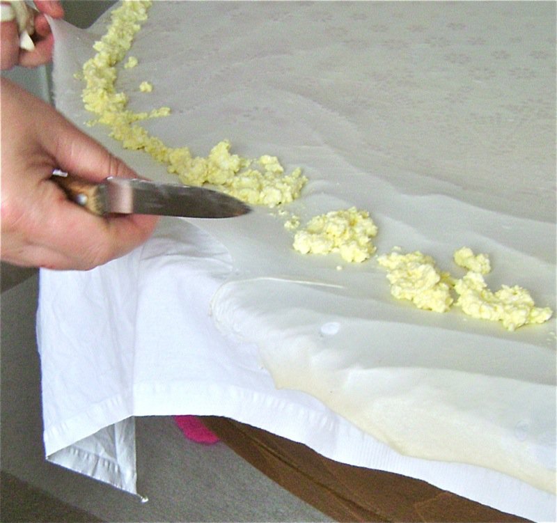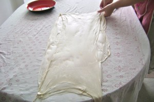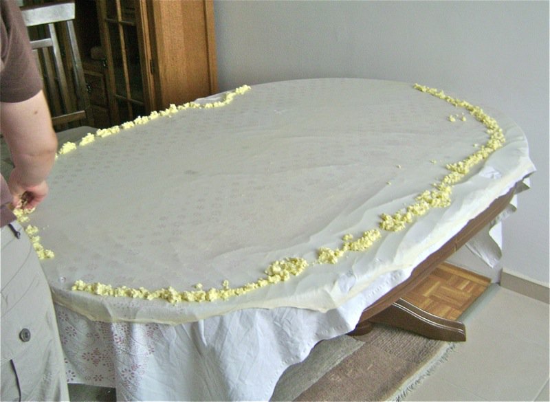 After the meal, we had a lot of dough left from all of the bits hanging over the table that were cut off of each pastry laden with filling. Elsada had them rolled into another dough ball, rolled, and resting while we ate. Now we make yet another traditional treat: maslenica! This is the pastry with nothing in it. Apparently they love to eat it as a treat with kajmak (impossible to describe unless you have had it, but it is a very sour milk cheese-like food) and pavlaka (similar to sour cream). Look at the gorgeous thin dough. Yes, there are some thicker bits as this is made with the left over pieces. It will probably not have the beautiful air bubbles in it, but it will be a beautiful treat.