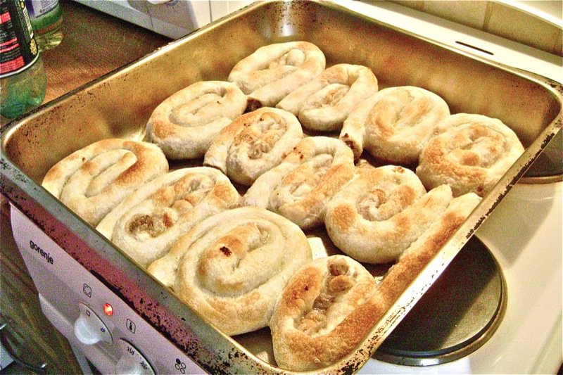 I was astounded by the flakiness of this pastry. I didn’t care for it too much on its own. It was definitely tasty, but there is no comparison with this to the filled pitas. I could not imagine going to the trouble of making this incredible ultra thin pastry and then leaving it without a filling. It was hard for me to understand. However, it is a cultural treat, and that I do understand. I would fill it with grated apples and cinnamon and sugar which is another traditional pita in this region, and another of Vanja’s favourites, as well!