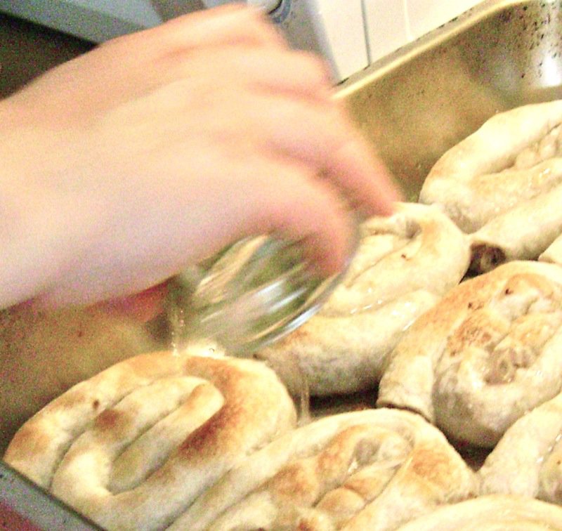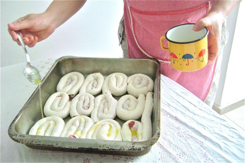 The butter is sparingly sprinkled on the pastry, and then it is rolled, cut and placed into a well oiled pan for baking, too.